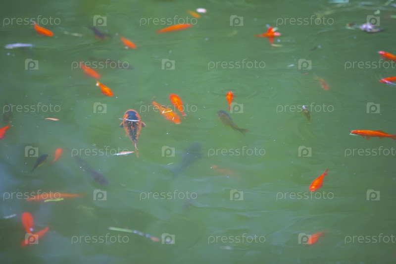 Золотые рыбки плавают в зеленой воде пруда