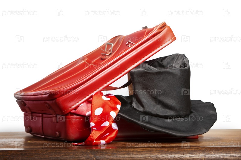 Красный чемодан с шляпой фокусника и красной тканью на белом фоне. Фон для фокусника и розыгрыша