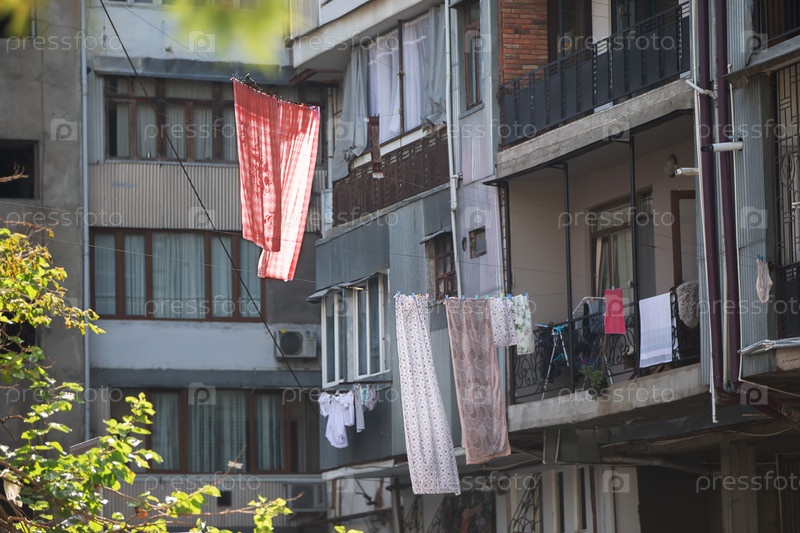 Цветное белье сушится на бельевых веревках в старом туристическом квартале