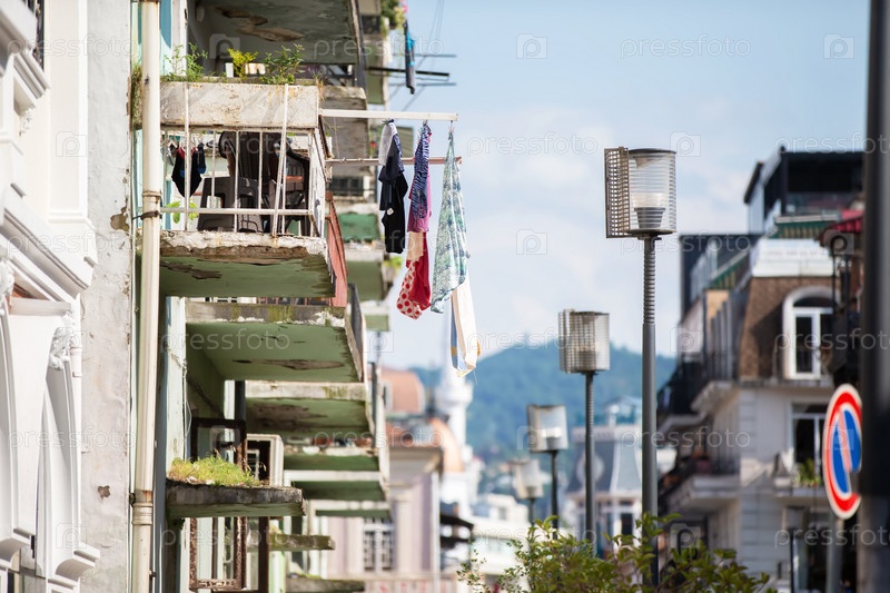 Туристические улочки грузинского города Батуми со старыми домами и бельем, сушимым на веревках