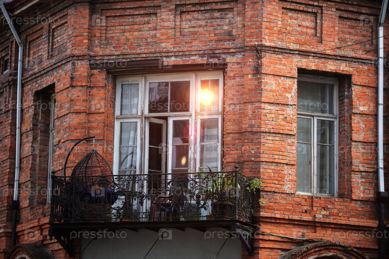 Окна с балконом в старом кирпичном здании с отражением солнца. Старый кирпичный дом с балконом