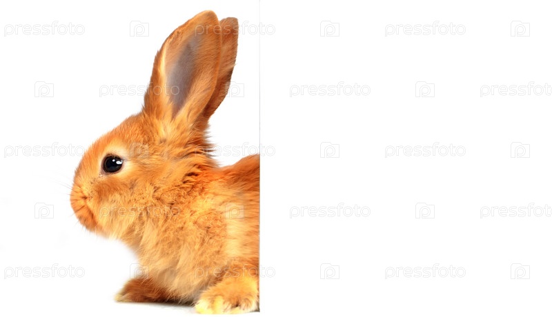 Забавный красный кролик наполовину покрыт белой чистой бумагой. Объявление или плакат для пасхальной недели