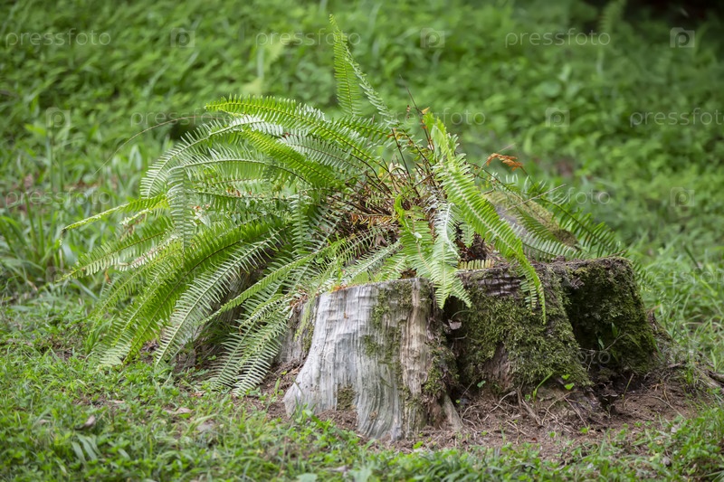 Зеленый папоротник растет возле пня в лесу. Цветочный лесной фон