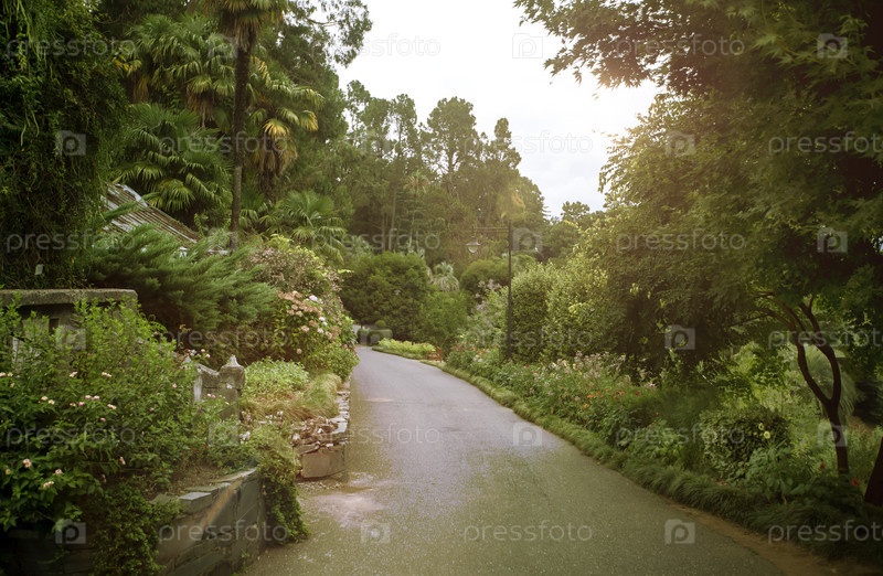 Красивая дорожка в летнем парке в теплых тонах. Ботанический сад