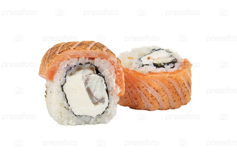 Суши крупным планом, изолированные на белом фоне. Суши-ролл, запеченный с красной рыбой, форелью, сыром Филадельфия и угрем. Меню японского ресторана