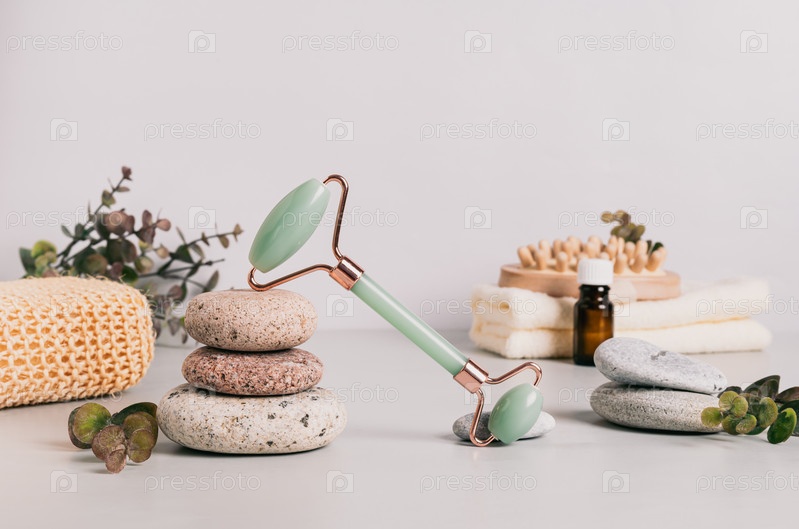 Нефритовый массажер для лица, спа-принадлежности и галька на столе