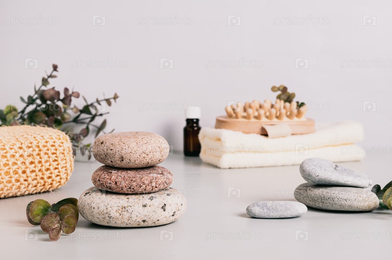 Спа-фон с предметами для расслабляющих процедур и галькой на столе