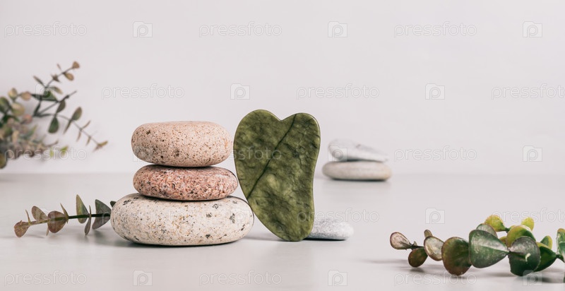 Нефритовый массажер гуаша и галька на столе веб-баннер