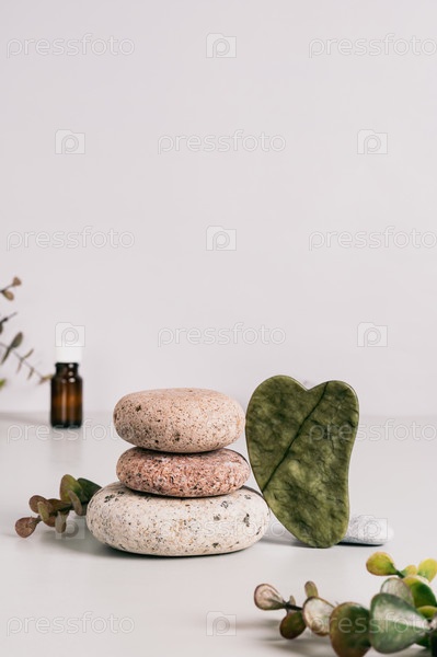 Массажер гуаша из нефрита, галька и спа-принадлежности на столе, вертикальный вид