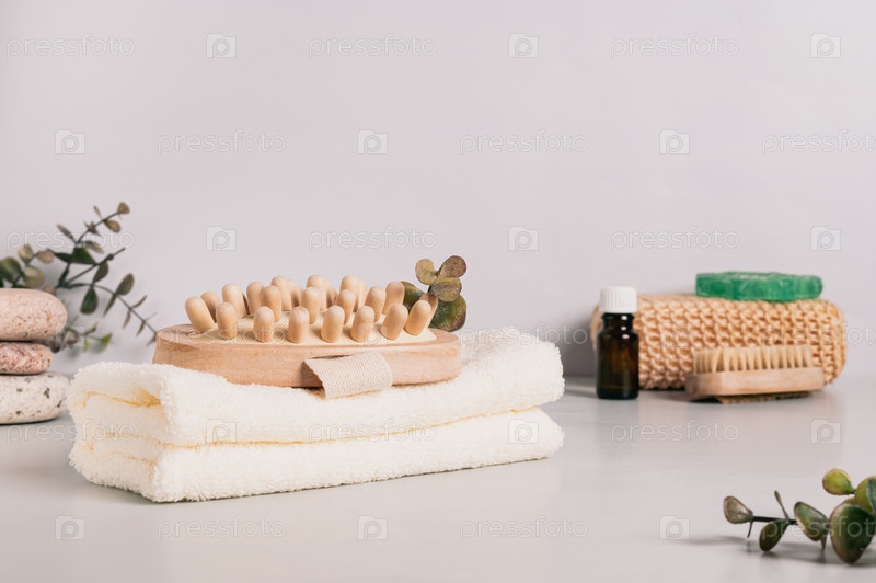Натуральный органический массажер для тела на полотенце и спа-принадлежности на столе