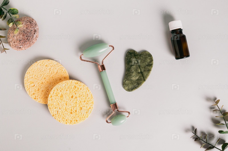 Нефритовые массажеры гуаша и роликовые, масло и губки для лица на светлом фоне вид сверху