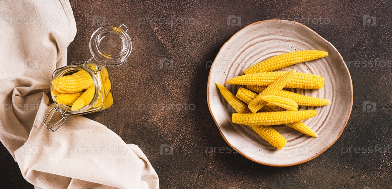 Порция консервированной кукурузы в початках на тарелке и в банке на столешнице вид веб-баннера