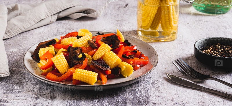 Аппетитный салат из консервированной кукурузы, жареных грибов и перца на тарелке веб-баннер