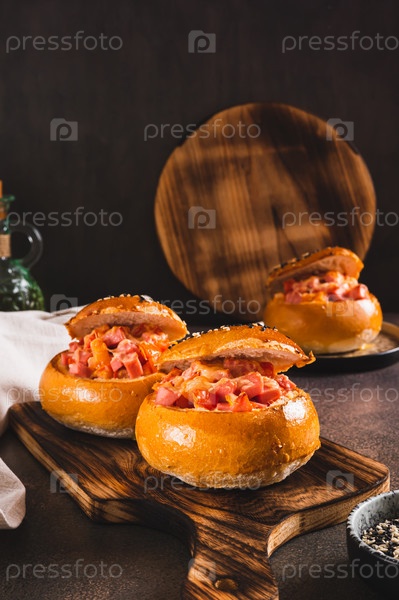 Запеченные бургеры с сосисками, помидорами, сыром и яйцом на доске на столе вертикальный вид