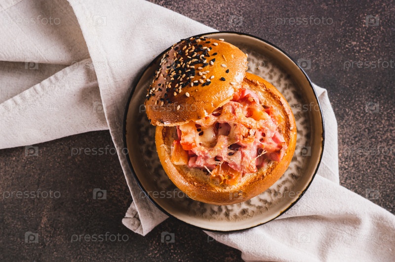 Запеченный бургер с сосисками, помидорами, сыром и яйцом на тарелке на столешнице