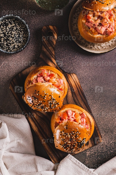 Запеченные булочки с начинкой из колбасы, помидоров и сыра на доске на столешнице и вертикальный вид