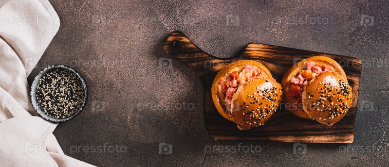 Запеченные булочки с начинкой из колбасы, помидоров и сыра на доске на столешнице веб-баннер
