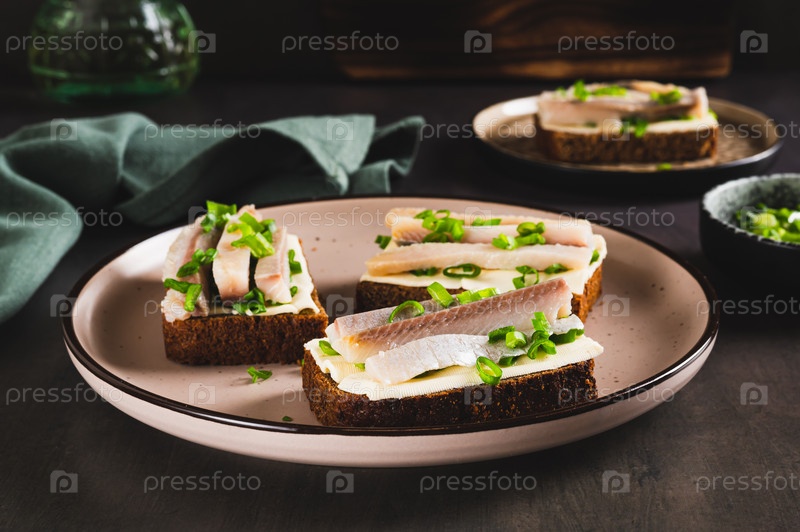 Скандинавские открытые бутерброды на ржаном хлебе с маслом и соленой сельдью на тарелке