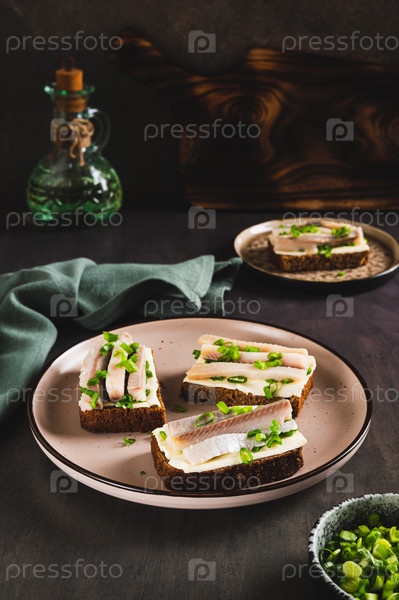 Скандинавские открытые бутерброды на ржаном хлебе с маслом и соленой сельдью на тарелке вертикальный вид