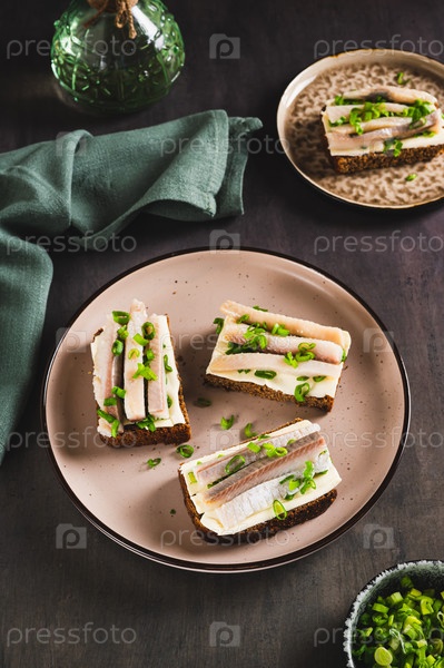 Норвежский смерреброд из ржаного хлеба, масла и соленой сельди на тарелке, вертикальный вид