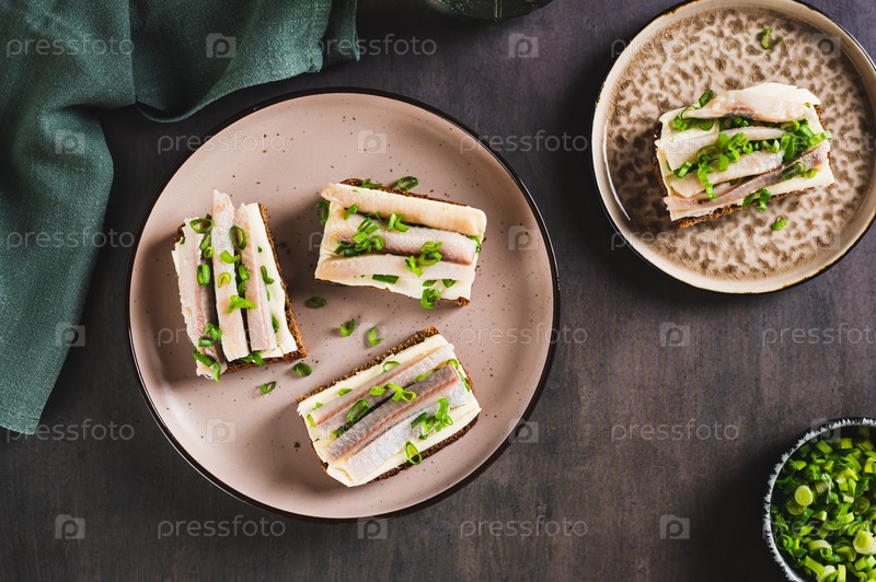 Скандинавские открытые бутерброды на ржаном хлебе с маслом и соленой сельдью на тарелке вид сверху