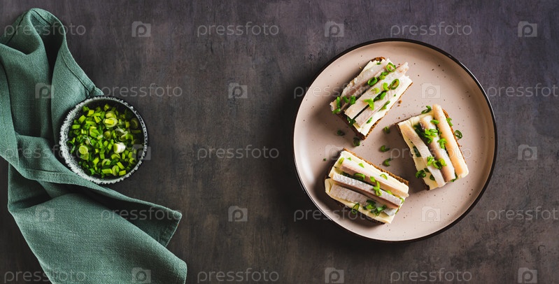 Норвежский смерреброд из ржаного хлеба, масла и соленой сельди на тарелке вид сверху веб-баннер