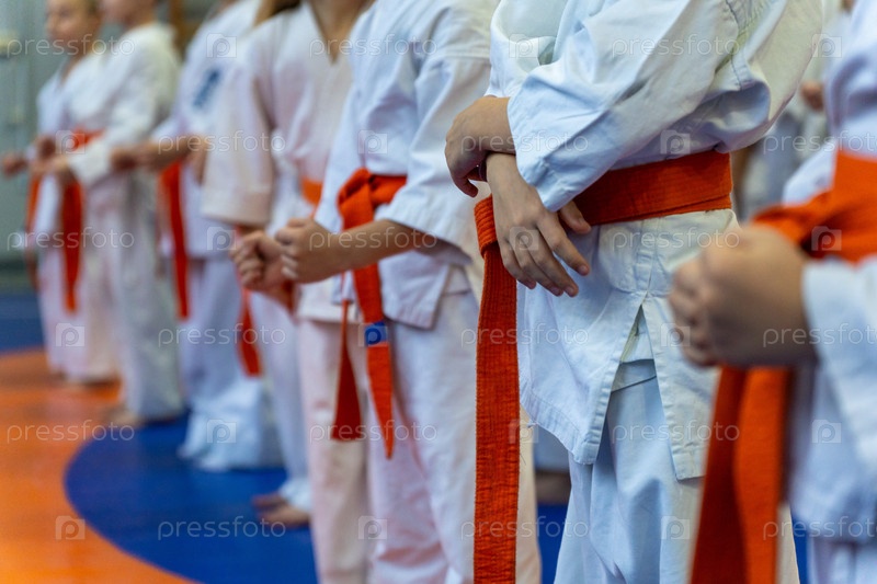 Крупный план ряда молодых спортсменов в белых кимоно каратэ со сжатыми кулаками. Фото для демонстрации или соревнования по каратэ. Концепция энергии и концентрации