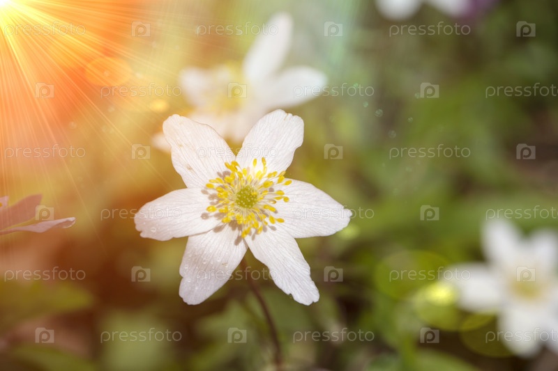 Цветочный естественный фон. Нежный белый цветок, освещенный желтыми лучами солнца