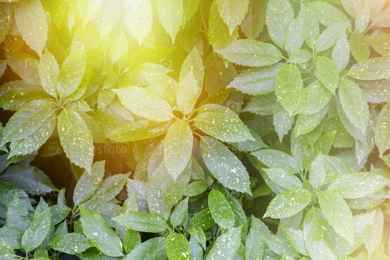 Листья вечнозеленого кустарника акуба в лучах желтого солнечного света. Цветочный фон