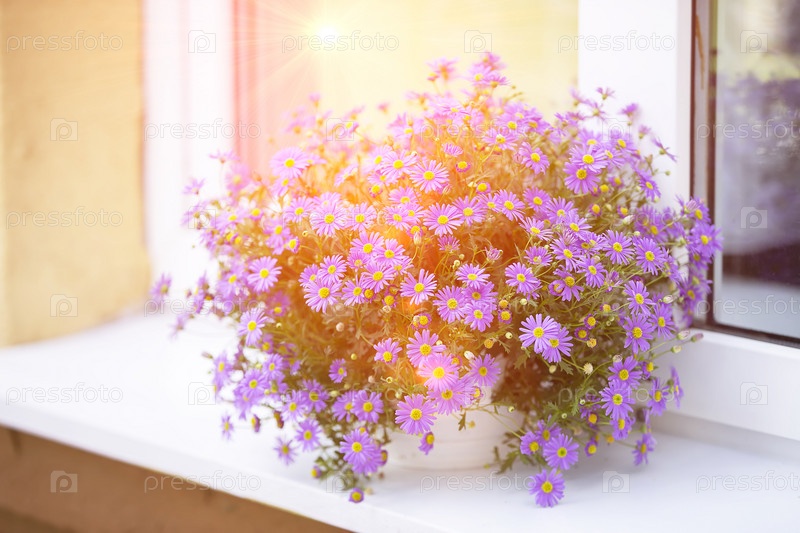 Букет фиолетовых хризантем на подоконнике, освещенном желтыми солнечными лучами. Цветы для балкона