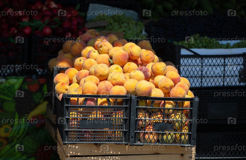 Перезрелые абрикосы в коробке на продажу. Летние фрукты на рынке