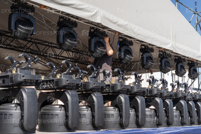 Монтаж светового оборудования на мобильной концертной сцене. Рабочий устанавливает прожекторы под навесом металлической конструкции. неузнаваемое лицо