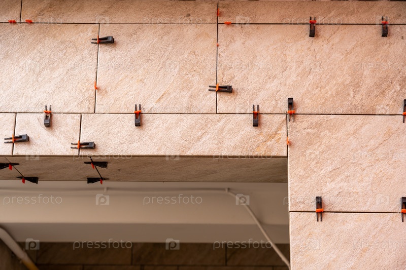Система выравнивания плитки с пластиковыми зажимами и клиньями, вставляемыми в плитку, пока застывает раствор