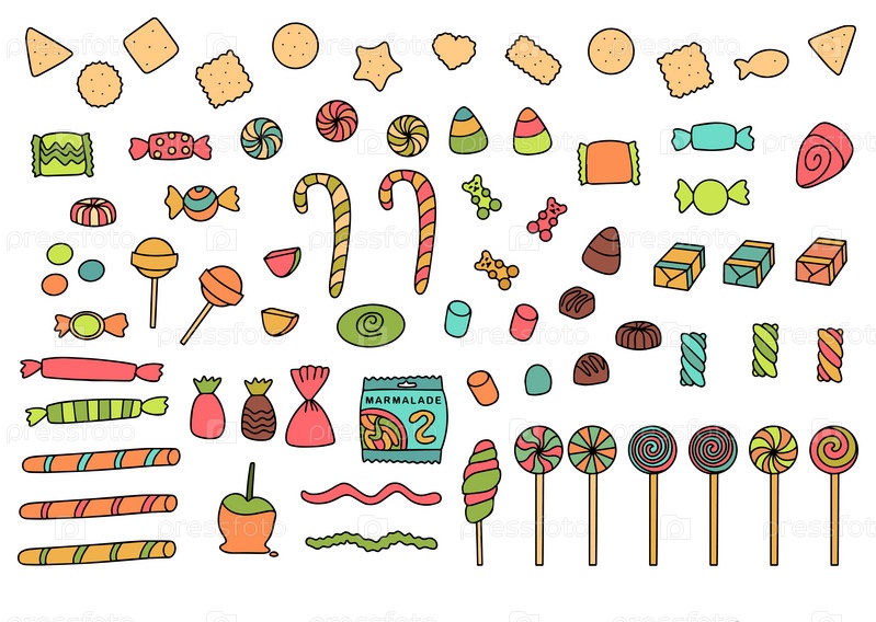 Ручно нарисованный набор сладостей и конфеты стиль Doodle сладкая еда векторная иллюстрация