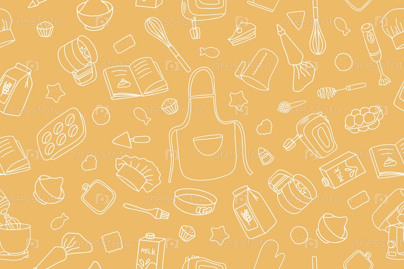 Модный образец аксессуаров для выпечки, нарисованный вручную в стиле doodle. Набор кухонных принадлежностей для приготовления вкусной выпечки. Вектор