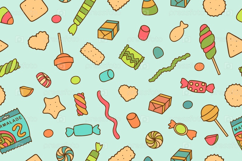 Бесшовный узор с красочными конфетами, печеньем и сладостями на синем фоне. Текстура для баннеров, обоев, текстиля, оберточной бумаги, кондитерских изделий или детского праздника. Вектор