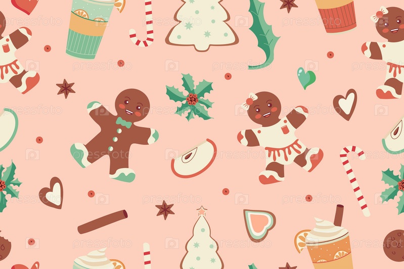Рождественский бесшовный узор с милыми персонажами, пряничными человечками, сладостями, праздничной выпечкой и напитками. Дизайн для рождественских фонов, упаковочная бумага