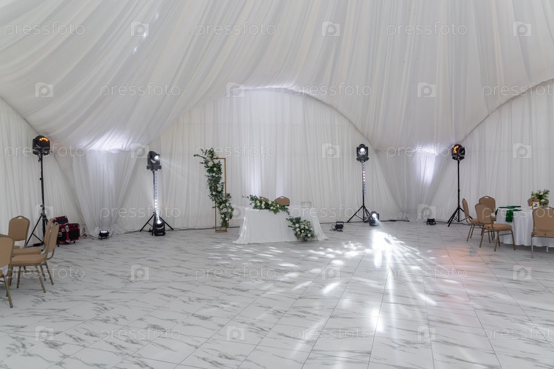 Концепция кейтеринга. Интерьер шатра для свадебного ужина, готов к приему гостей