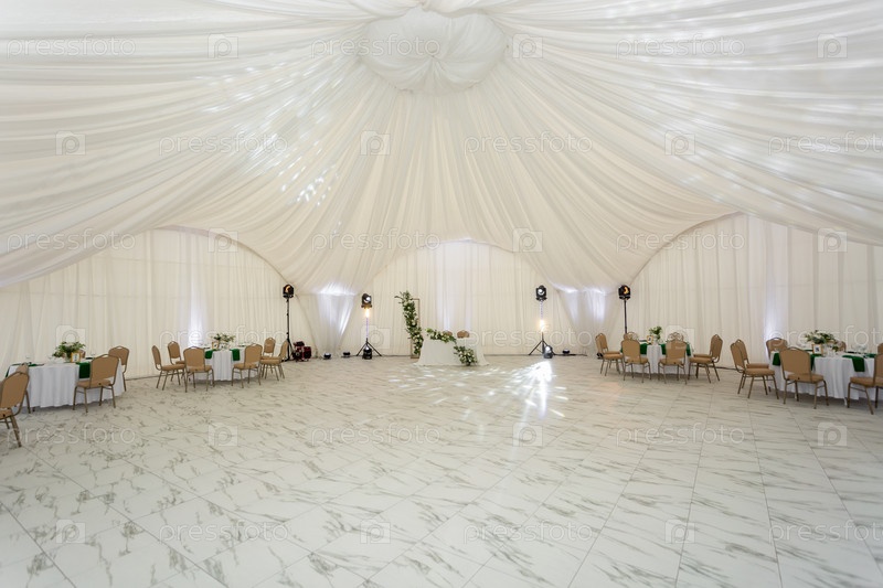 Крупный план бокалов для вина, серебряных столовых приборов и зеленых салфеток на круглых столах, покрытых белой скатертью. Концепция кейтеринга. Интерьер шатра для свадебного ужина, готов для гостей