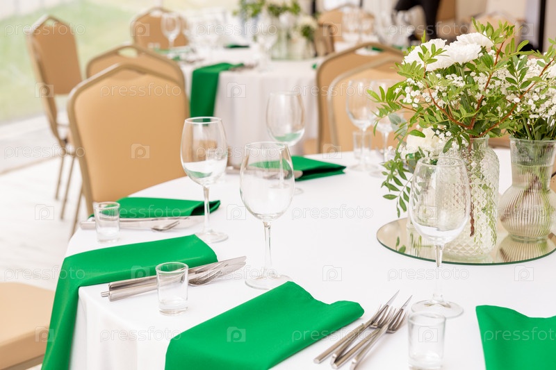 Крупный план бокалов для вина, серебряных столовых приборов и зеленых салфеток на круглых столах, покрытых белой скатертью. Концепция кейтеринга. Интерьер шатра для свадебного ужина, готов для гостей