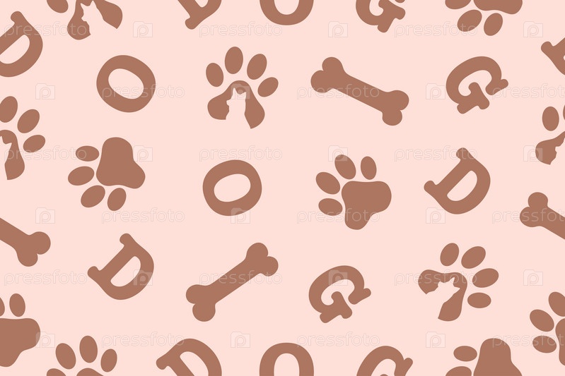 Бесшовный узор. Фон слова «собака» и отпечаток лапы. Бесшовный узор в цвете мокко-мусс. Вектор