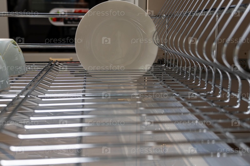 Чистая и организованная кухонная обстановка с хромированной сушилкой для посуды с тарелками и чашками. Идеально подходит для демонстрации эстетики и функциональности современной кухни
