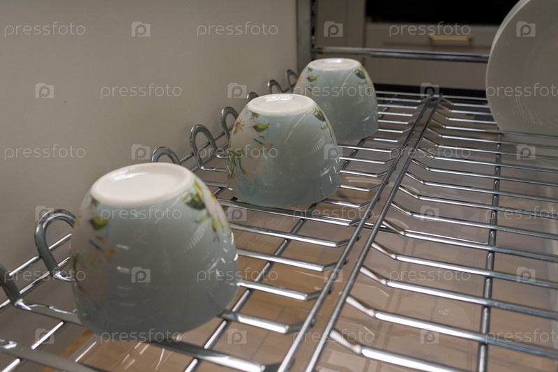 Чистая и организованная кухонная обстановка с хромированной сушилкой для посуды с тарелками и чашками. Идеально подходит для демонстрации эстетики и функциональности современной кухни