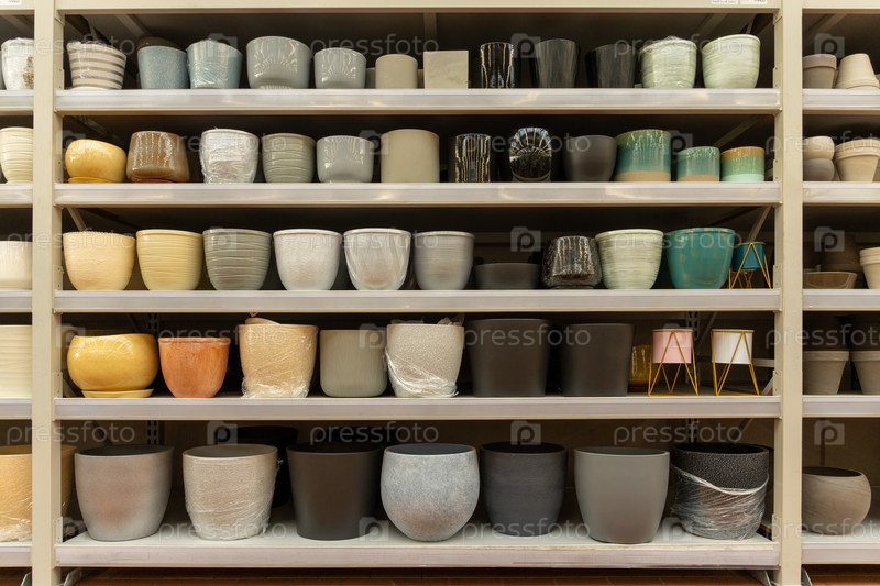 Разнообразие красочных керамических и пластиковых цветочных горшков на полке в магазине растений. Покупки модных горшечных цветов и концепция дизайна интерьера дома