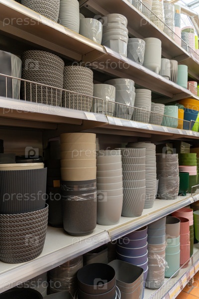 Разнообразие красочных керамических и пластиковых цветочных горшков на полке в магазине растений