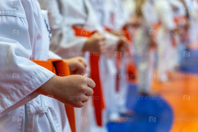 Крупный план ряда молодых спортсменов в белых кимоно каратэ со сжатыми кулаками. Фото для демонстрации или соревнования по каратэ. Концепция энергии и концентрации