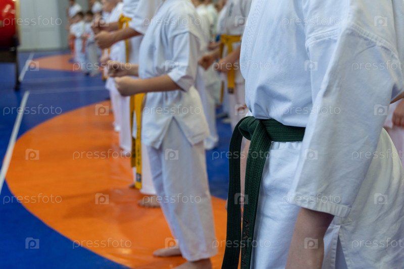 Крупный план ряда молодых спортсменов в белых кимоно каратэ со сжатыми кулаками. Фото для демонстрации или соревнования по каратэ. Концепция энергии и концентрации
