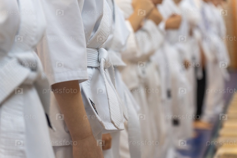 Крупный план ряда молодых спортсменов в белых кимоно каратэ со сжатыми кулаками. Фото для демонстрации или соревнования по каратэ. Концепция энергии и концентрации