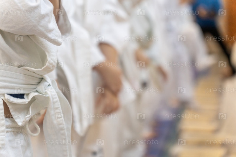 Крупный план ряда молодых спортсменов в белых кимоно каратэ со сжатыми кулаками. Фото для демонстрации или соревнования по каратэ. Концепция энергии и концентрации