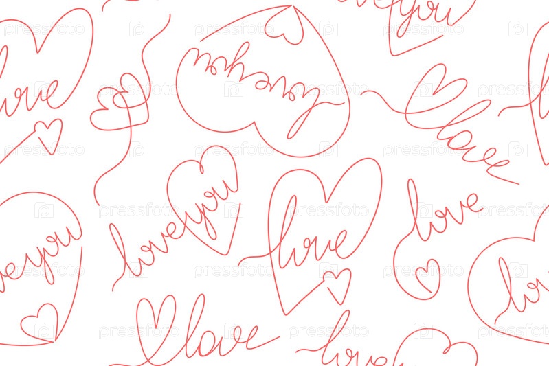 Бесшовный узор с сердечками и надписями о любви. День святого Валентина, концепция дня свадьбы. Модный фон для приглашений, поздравительных открыток, принтов и плакатов. Минималистская иллюстрация на белом фоне. Вектор